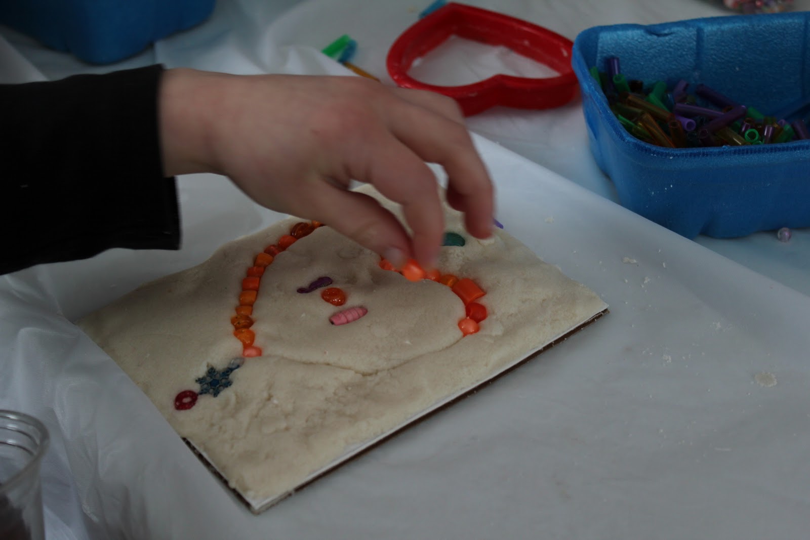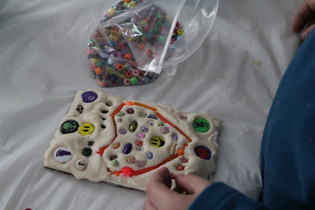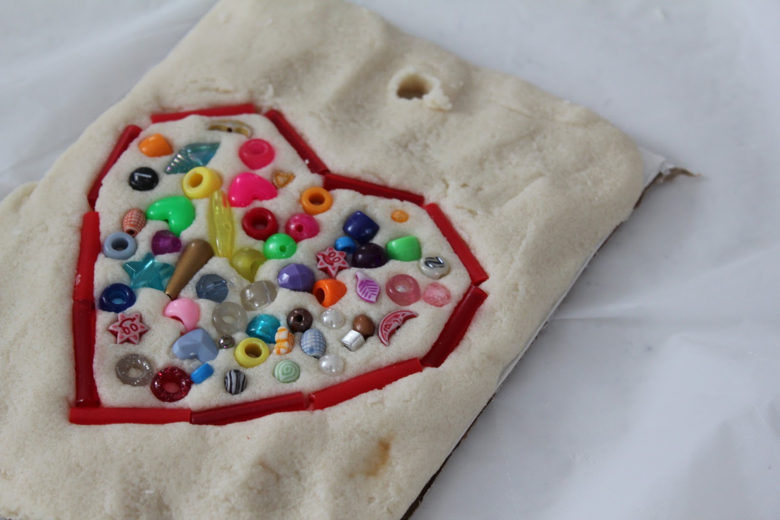 Once their dough was sufficiently mixed, they pressed it onto pieces of cardboard. We used a cookie cutter to make a heart shape (to tie in the idea that honesty is one way we show love to others). Then I had them pick one color from a big stash of beads to outline their hearts.