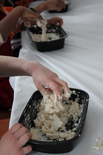 First, we made individual trays of salt dough – equal parts salt, flour, and water.