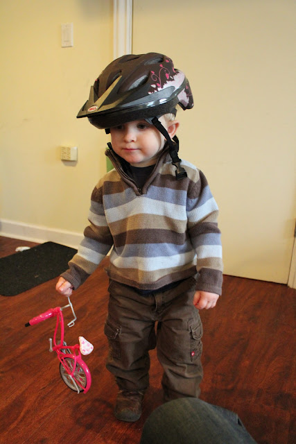 BoyWonder, in the bike helmet he’d just found, with a pink Barbie bike.