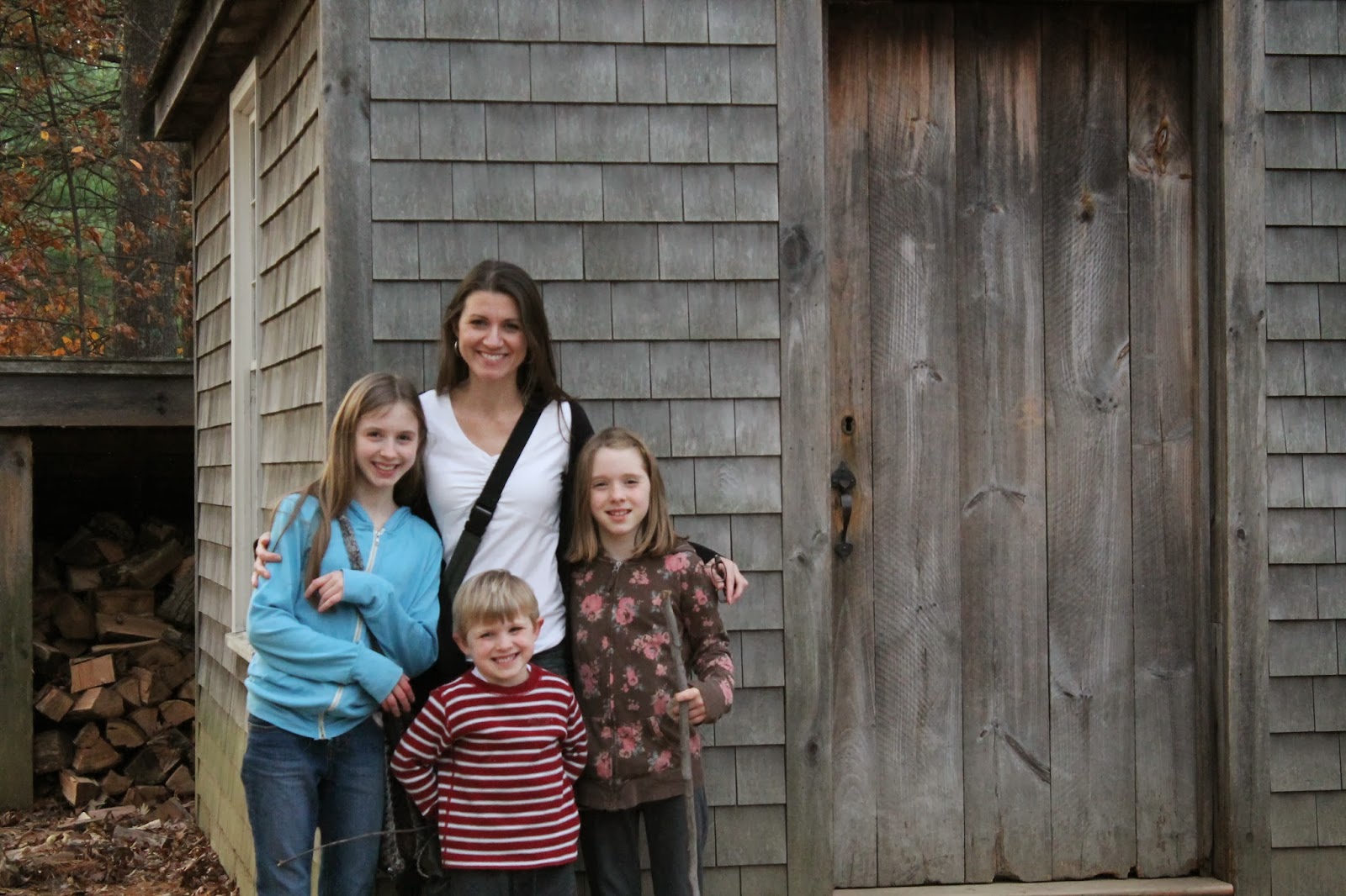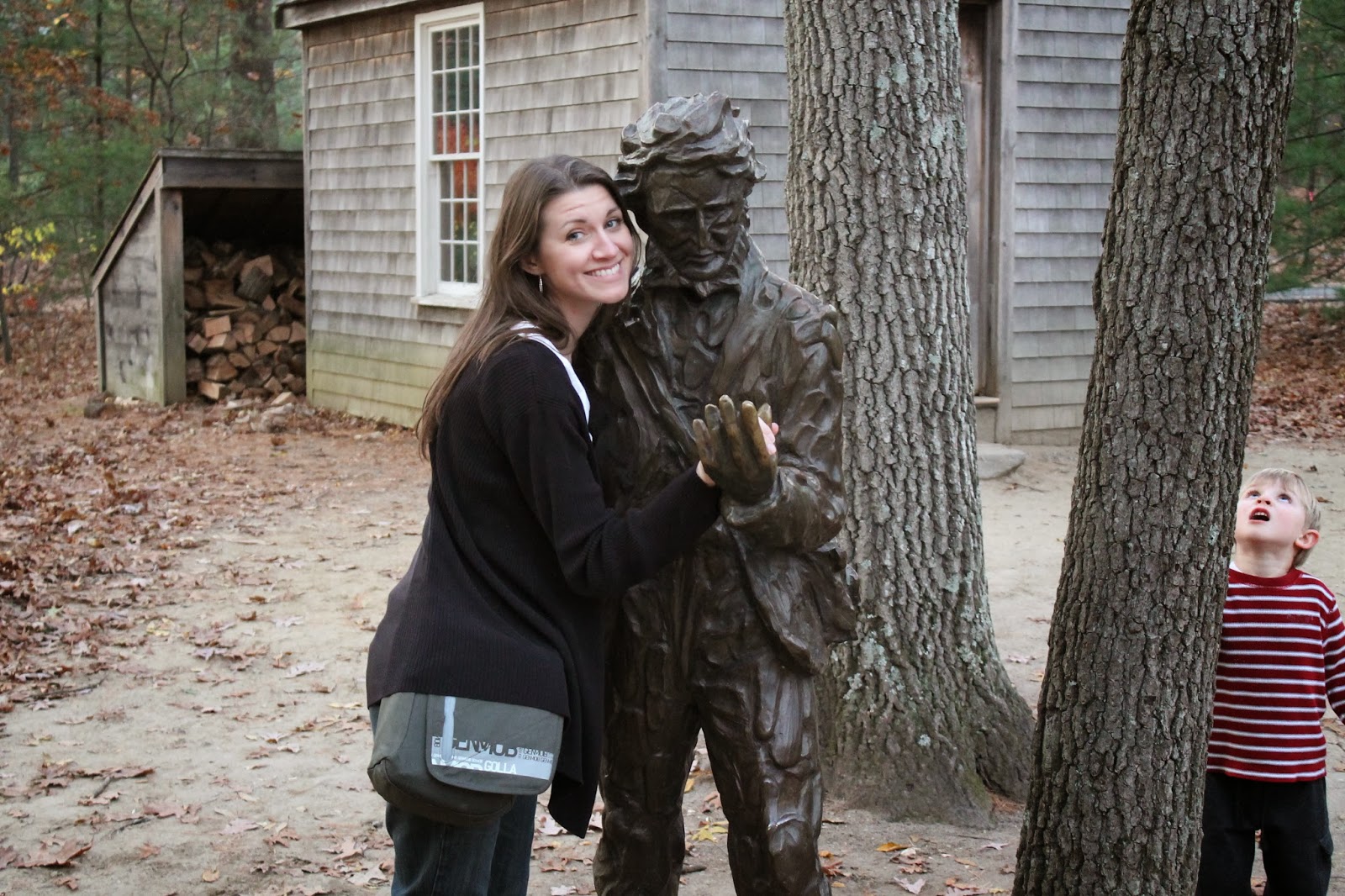 Our final stop for the day: Walden Pond. Here the kids and I stand in front of a replica of Henry David Thoreau’s tiny, self-built cabin, where he lived and wrote for two years.